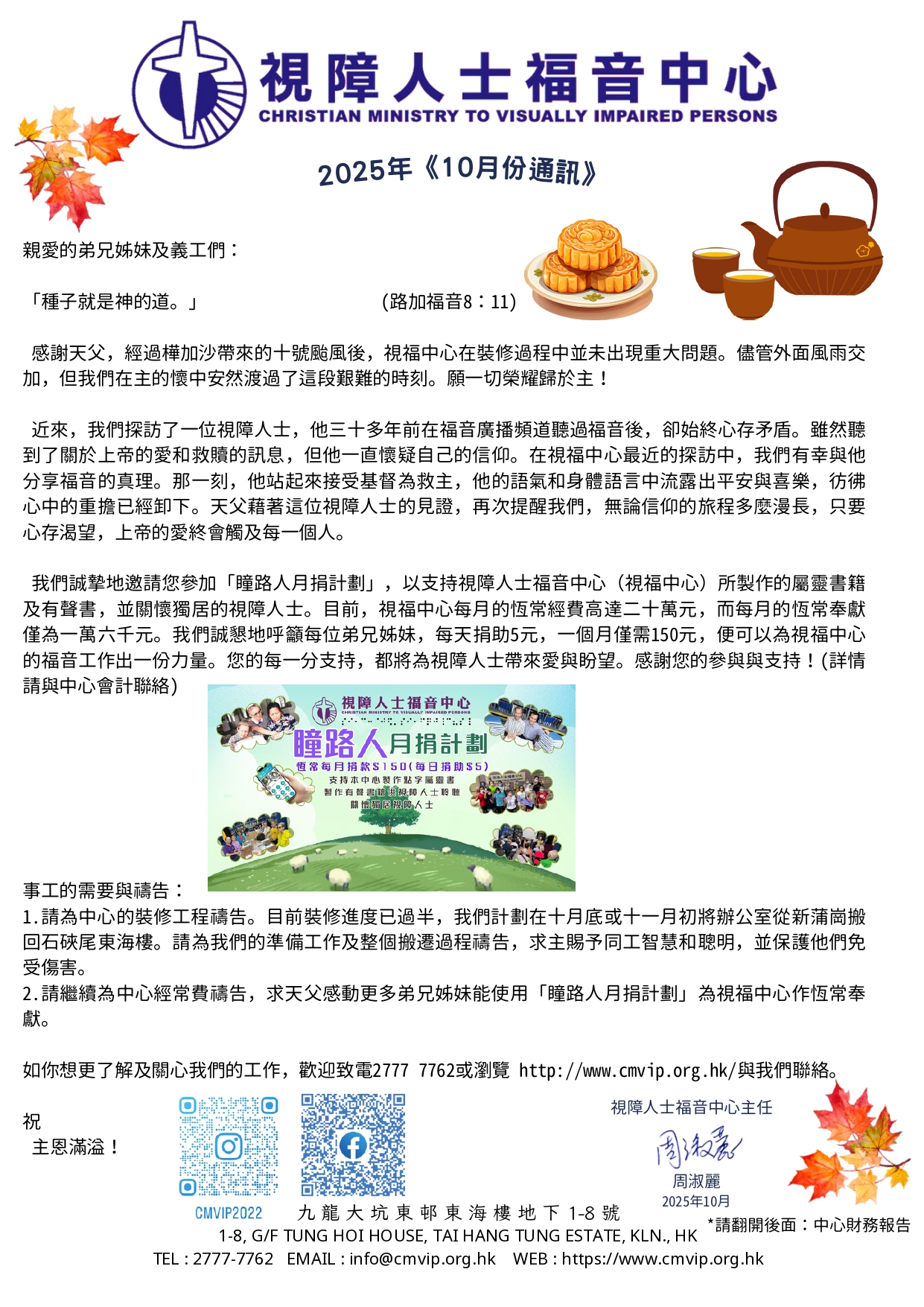 我們誠摯地邀請您參加「瞳路人月捐計劃」,以支持視障人士福音中心(視福中心)所製作的屬靈書籍及有聲書,並關懷獨居的視障人士。目前,視福中心每月的恆常經費高達二十萬元,而每月的恆常奉獻僅為一萬六千元。我們誠懇地呼籲每位弟兄姊妹,每天捐助5元,一個月僅需150元,便可以為視福中心的福音工作出一份力量。您的每一分支持,都將為視障人士帶來愛與盼望。感謝您的參與與支持!(詳情請與中心會計聯絡)